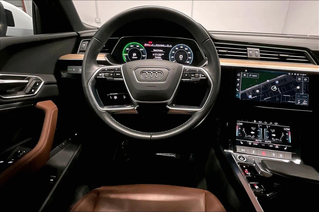 AUDI RINGS BEAM FRONT & REAR DOORS: Lower door trim LED light displaying Audi logo (4 rings). Audi Premium with Glacier White Metallic exterior and Okapi Brown interior features a Electric Motor. Non-Smoker vehicle, Full four wheel alignment, Four new tires, Rear wiper, Front wipers, 40k Service completed