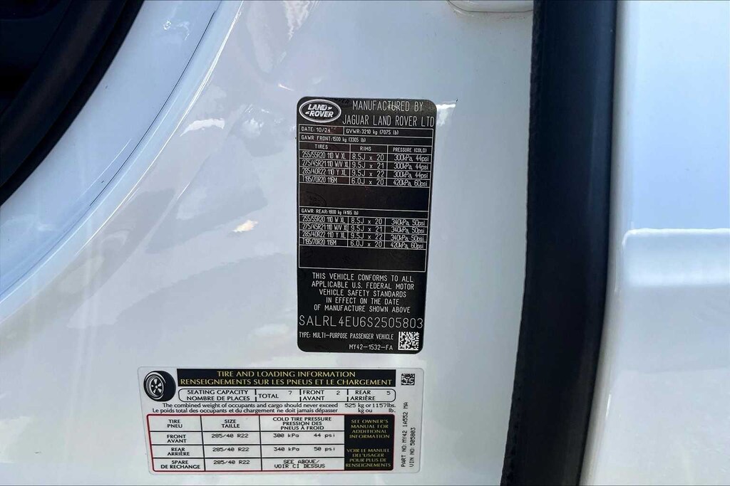 Fuji White exterior and Ebony interior. Excellent Condition, CARFAX 1-Owner. Third Row Seat, Heated Leather Seats, Moonroof, Navigation, All Wheel Drive, Panoramic Roof, Aluminum Wheels, REAR SEAT CONVENIENCE PACK, LAND ROVER HANDOVER PACK, PREMIUM INTERIOR PROTECTION PACK, WHEEL PROTECTION PACK, FUJI WHITE, NATURAL SHADOW OAK VENEER, EMERGENCY PACK.